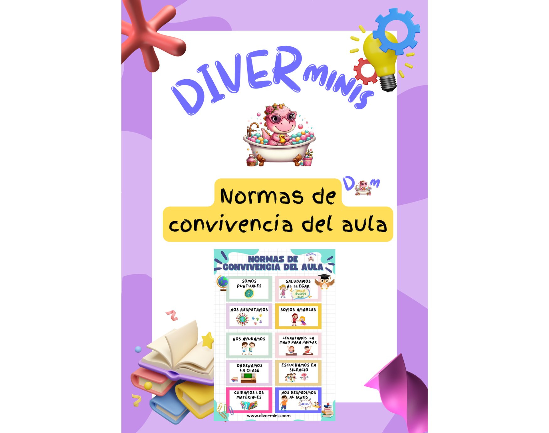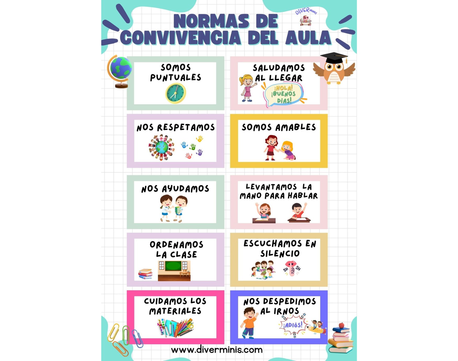Plantilla con las normas del aula. En ella se podrán ver 10 acciones o normas para que todos y todas, niños, niñas, maestros y maestras las lleven a cabo.