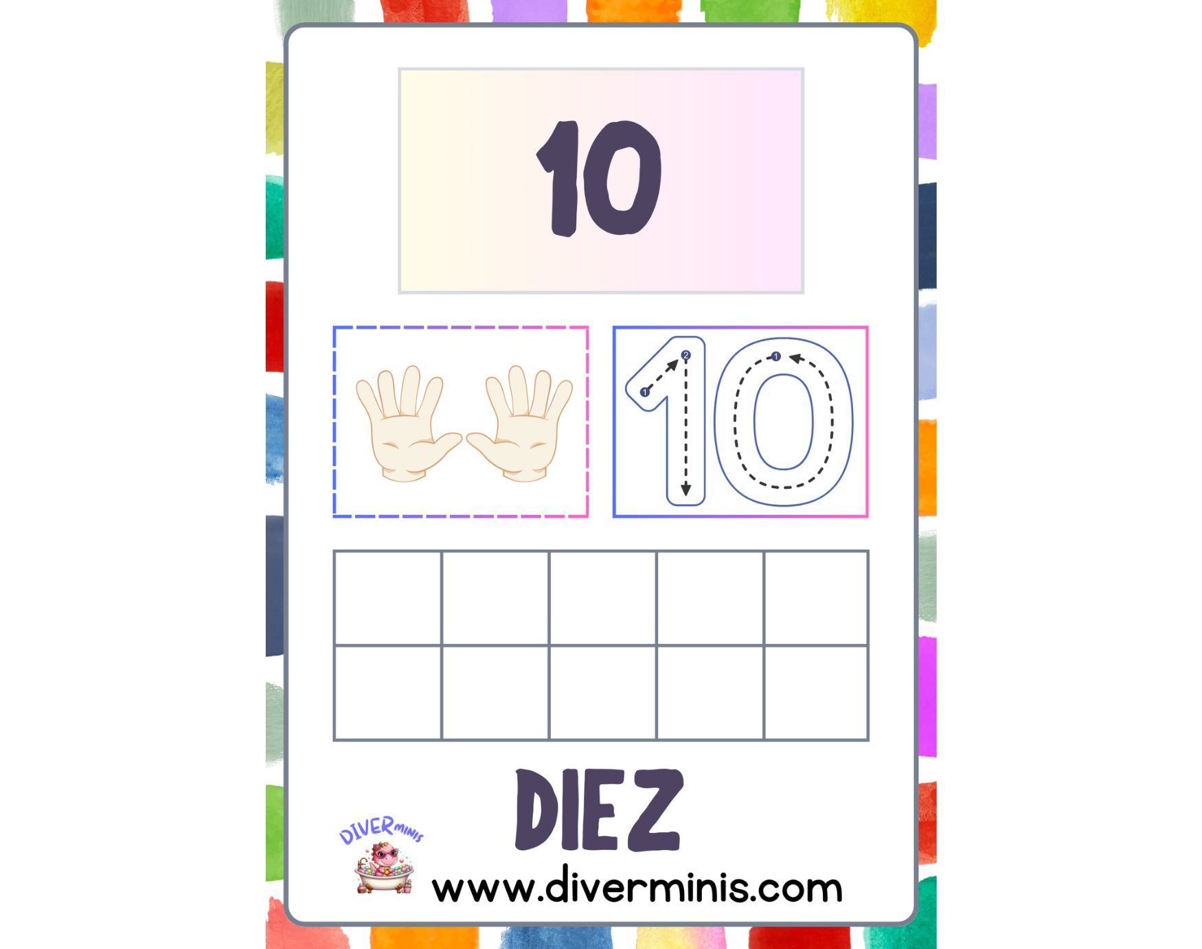 Este recurso educativo descargable está diseñado para que los peques se inicien en el mundo de los números de una manera lúdica y educativa. Cada página está dedicada a un número del 1 al 10 e incluye: