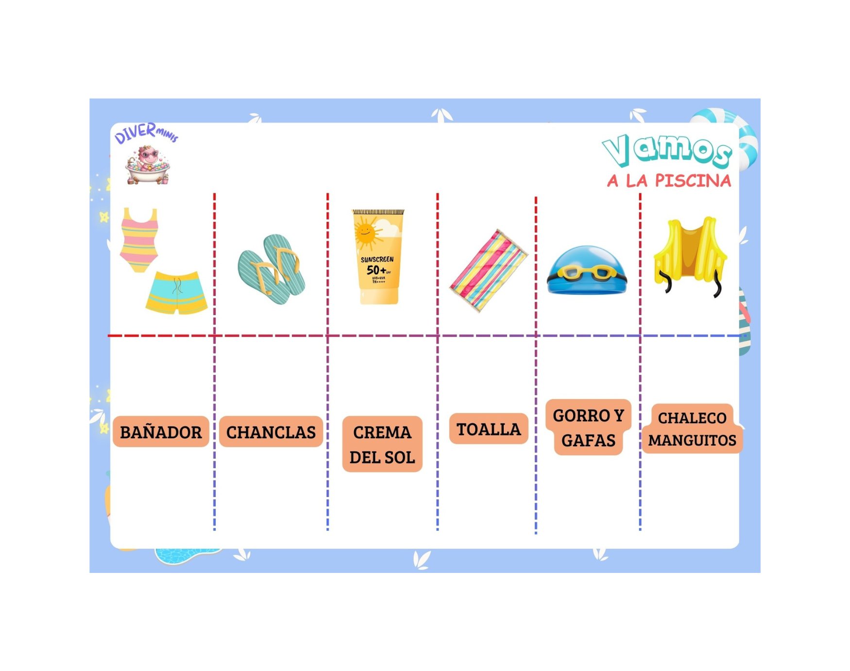 Este recurso educativo es ideal para dar autonomía a los y las peques y sean capaces de preparar lo necesario para pasar un estupendo rato en la piscina.